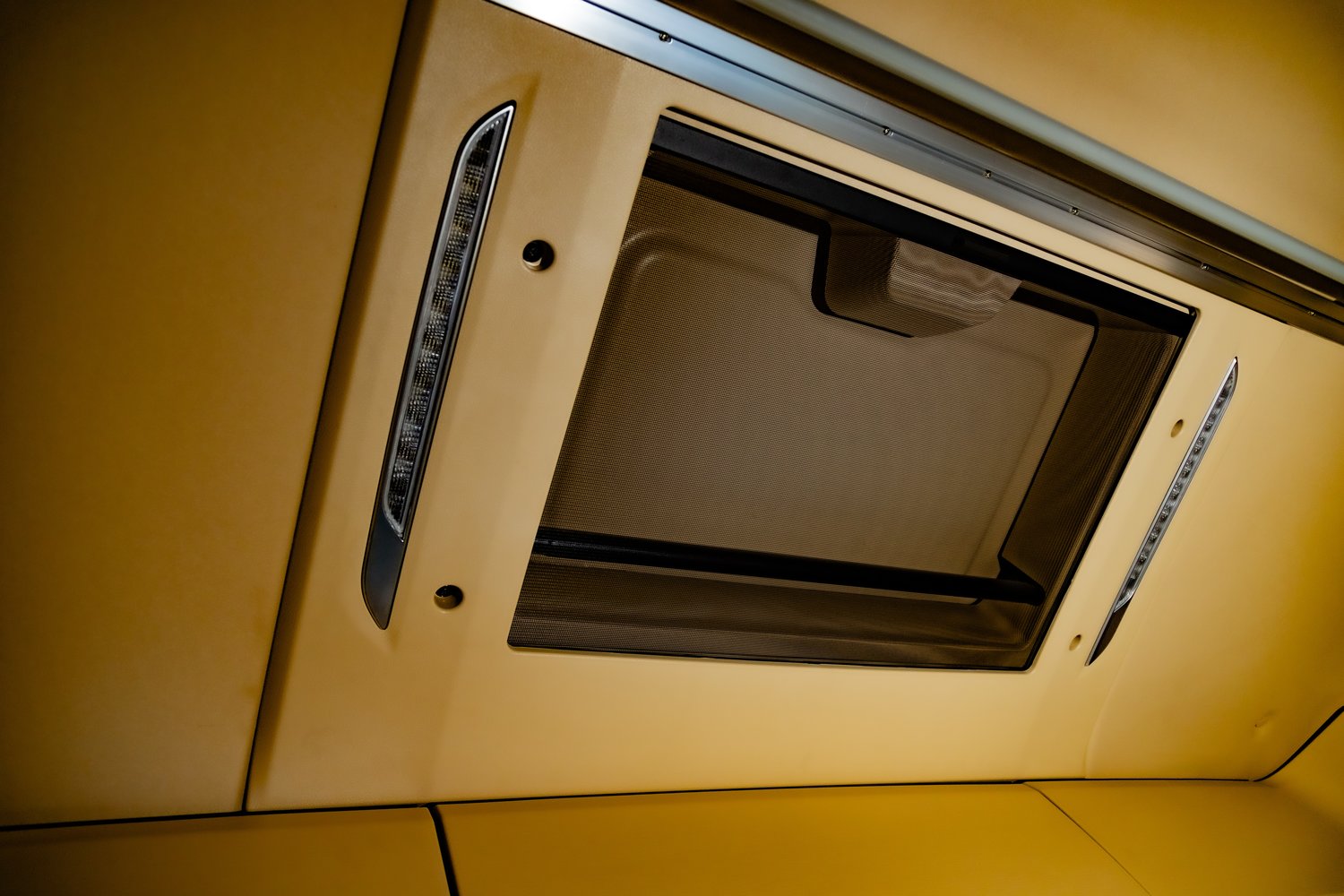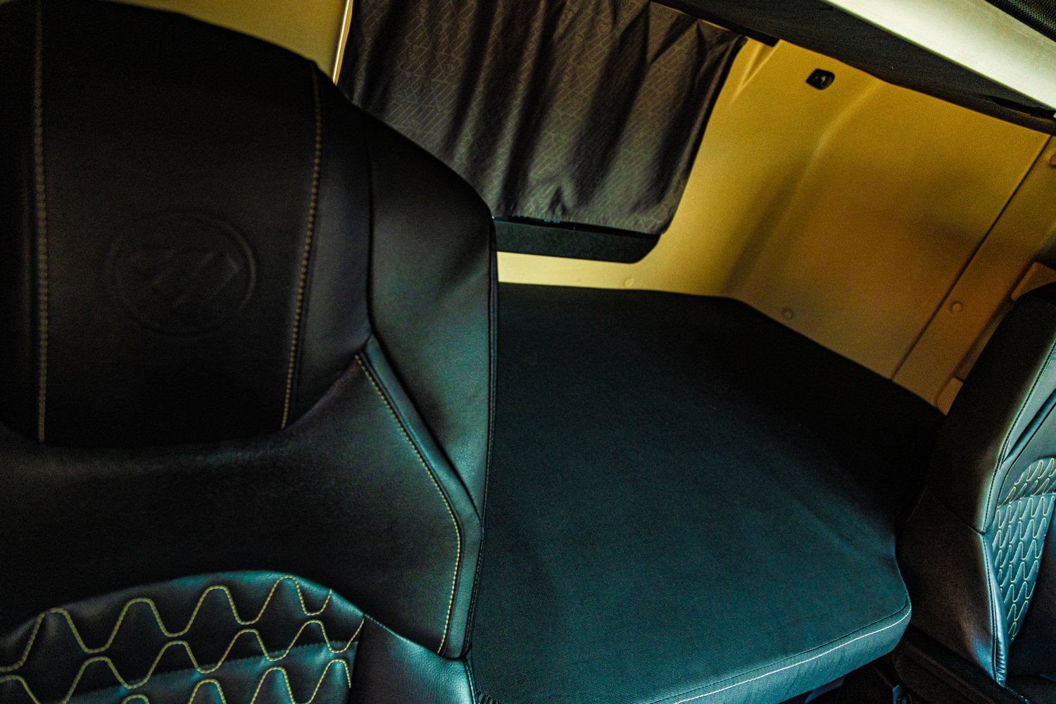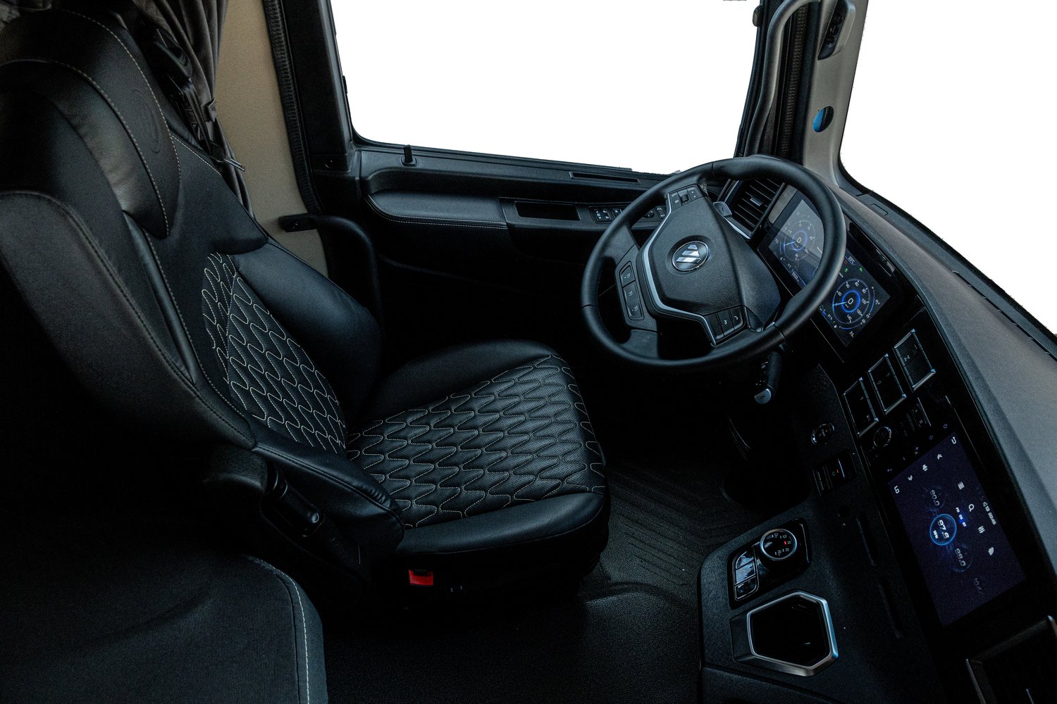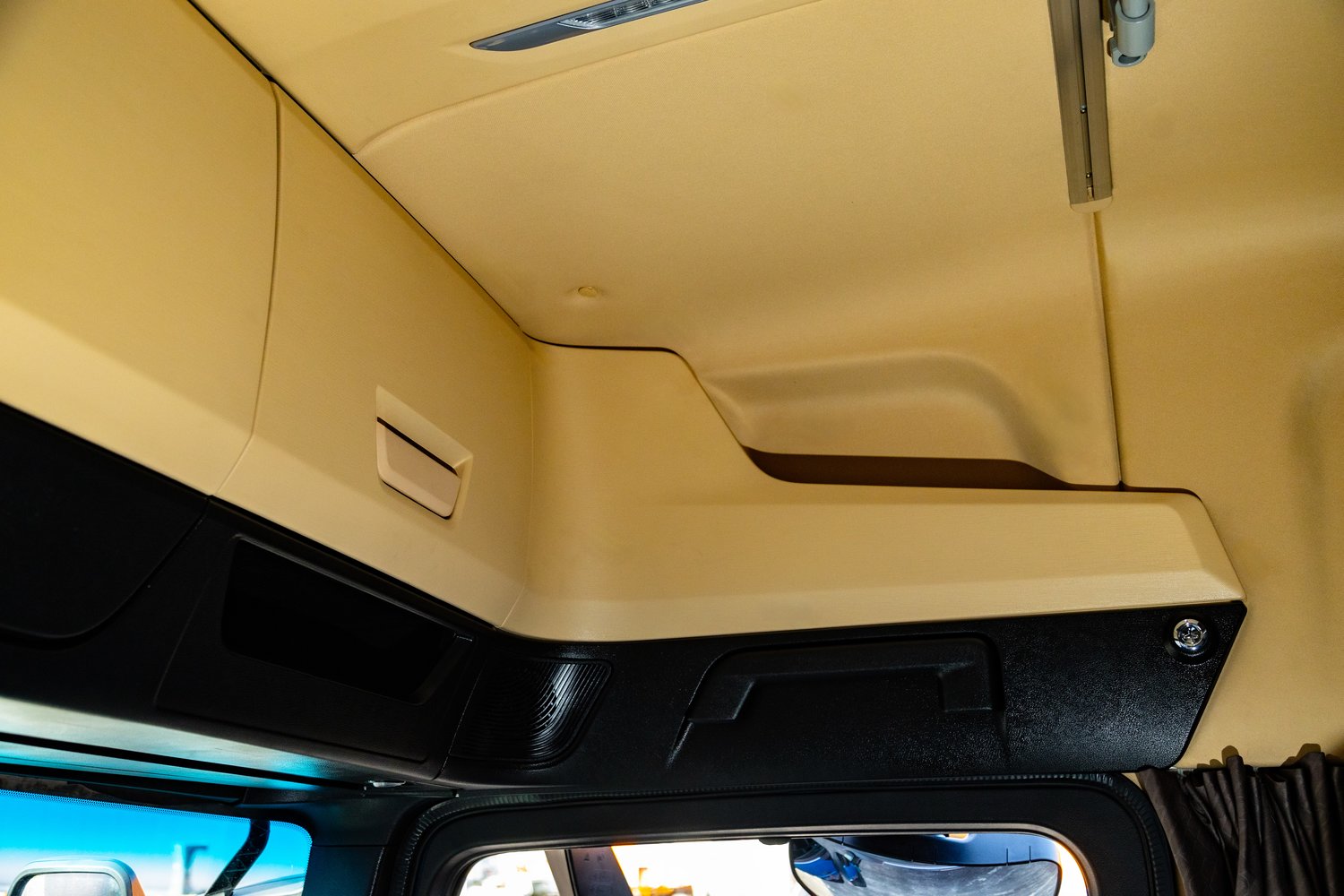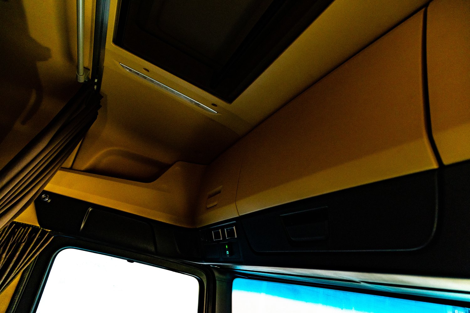 • Водительское сиденье на пневмоподвеске, с подогревом, вентиляцией и массажем. В штатной комплектации системы кругового обзора и контроля усталости водителя, воздушный отопитель, кондиционер, центральный замок, полностью цифровая панель приборов.
